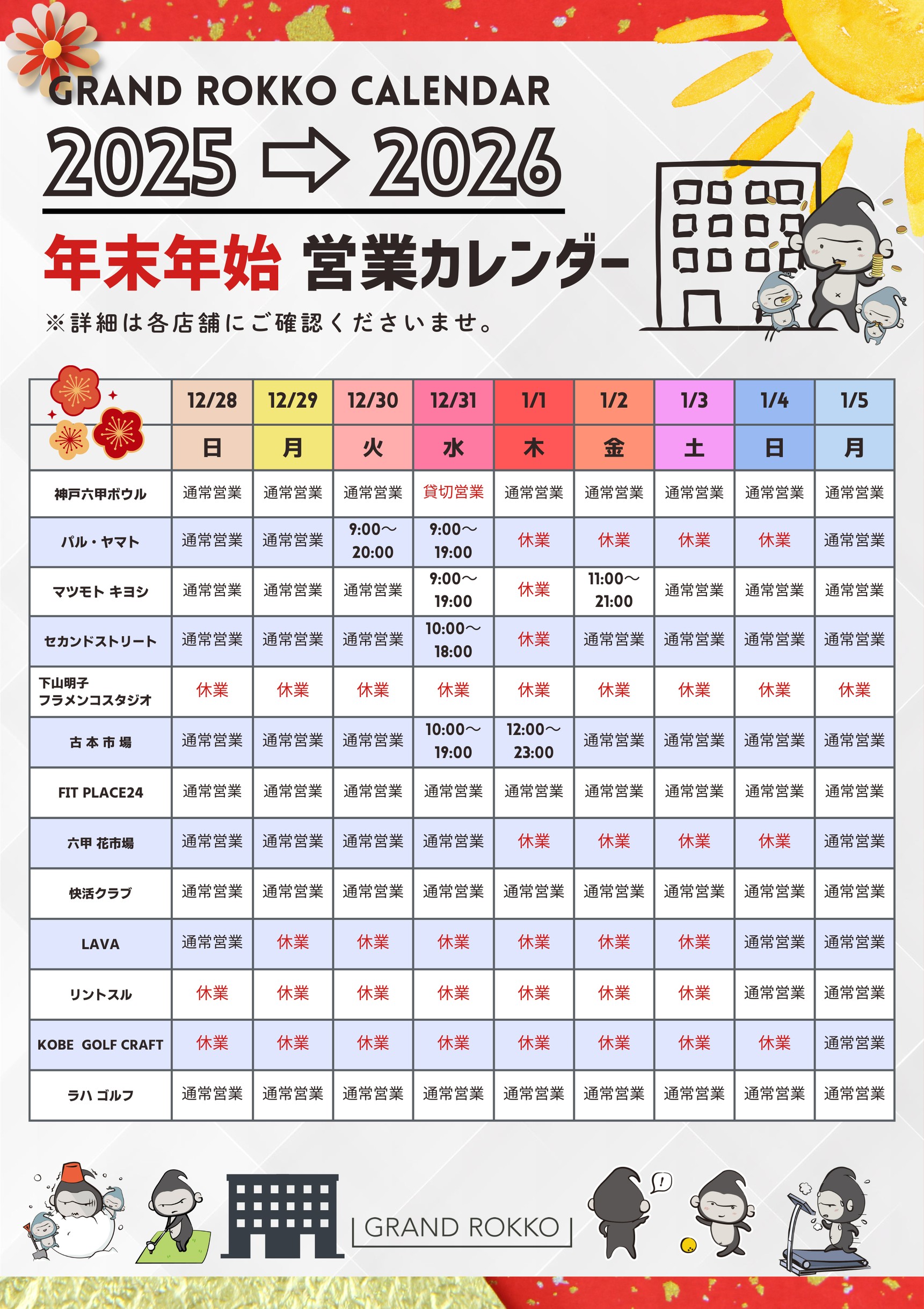 グランド六甲ビル各店舗の年末年始の営業は以下の通りとなります。